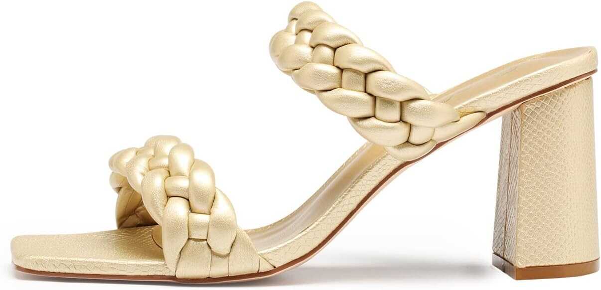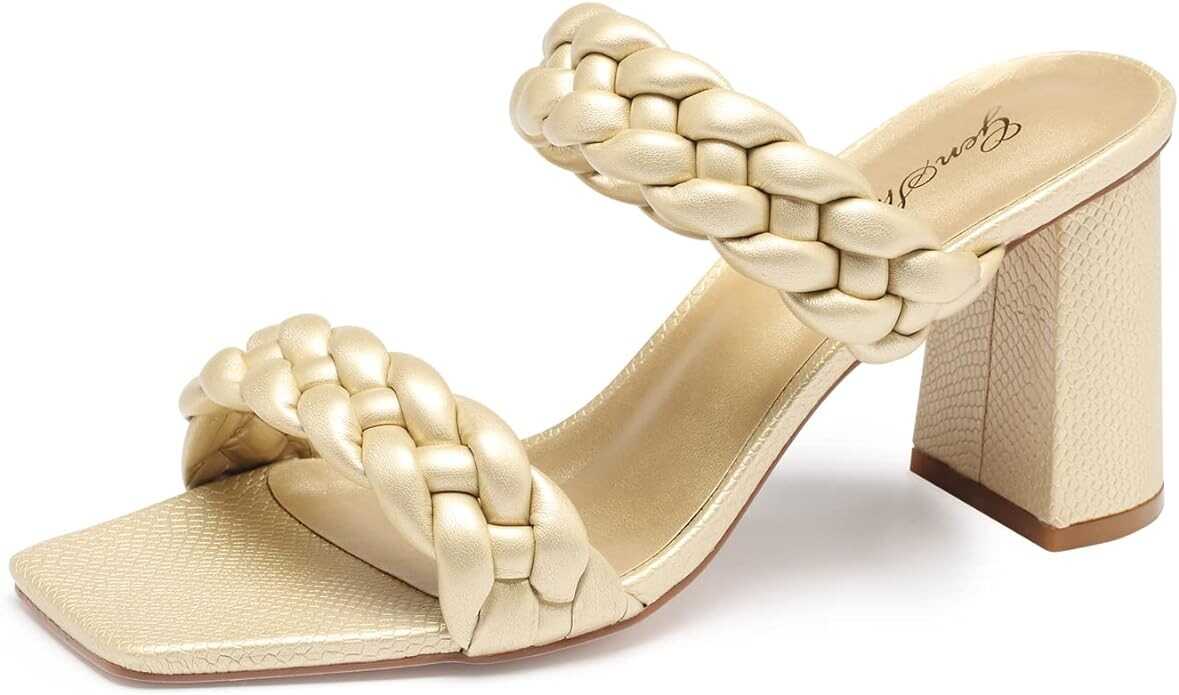 GENSHUO Women Squere Open Toe Heels Braided Two Strap Low Block Chunky Heeled Sandals