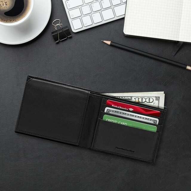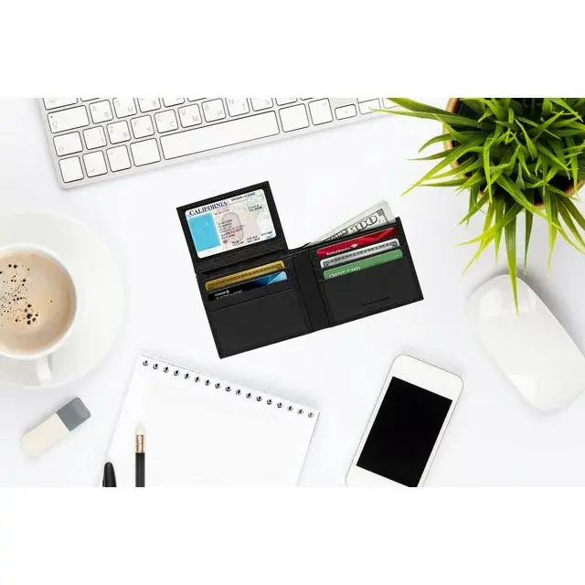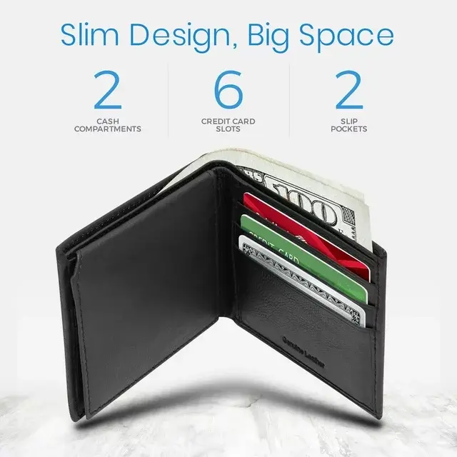 • ELITE FEATURES AND SLICK DESIGN: This men's wallet is only 0.3 inches thick and measures only 4.5 inches x 3.25 inches. Yet, it is very convenient with 8 credit card slots, 2 slip pockets where you can add more credit cards, insurance cards, or business cards, and a cash compartment. This bifold wallet will conveniently fit in a front pocket or a back pocket. This wallet makes it easy to carry all your cards and meet your daily needs.