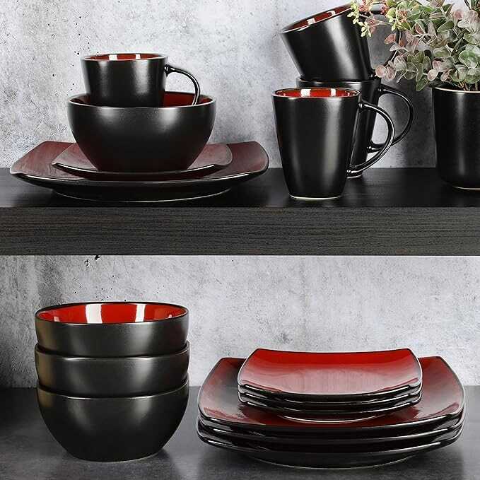 CARE INSTRUCTIONS: beautiful red and black dishes that are also dishwasher and microwave safe