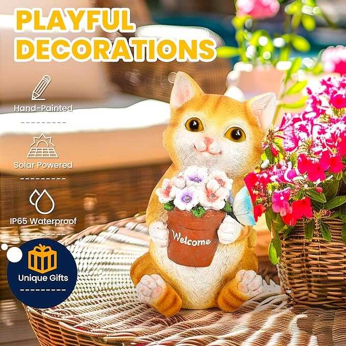 • [Great Gift Choice]: Look no further for the purr-fect gift—our Solar Cat with Flower Pot is tailor-made for cat lovers and resonates with the warmth of home and family, making it an ideal gift for Mother's Day, birthdays, housewarmings.