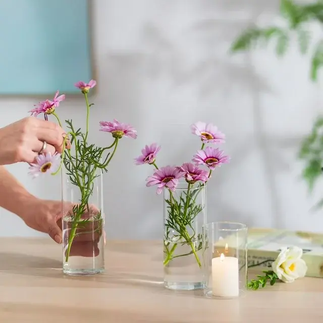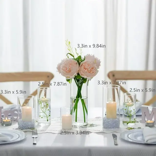 Cylinder vases are the simplest and most elegant glass vases for centerpieces. The classy and beautiful look makes glass cylinder vases the most effective and attractive glass flower vases, and they can be decorated for almost any occasion such as a party, wedding or other event decoration. You can never go wrong with a clear hurricane vase. Unlike normal round glass vase sets, Glasseam's bulk cylindrical vases are made from high-quality crystal clear glass that is 100 percent hand-blown. They are so versatile that they are not only popular to be used as hurricane vases for flowers, but also used as tall glass candle holders (pillar candles holder or floating candles holders), pot-pourri containers and table centerpieces (filled with gems, floating pearls, LED lights, rose petals or other vases filler). These tier-high clear floating candle vases are a fabulous addition to any event table centerpiece.