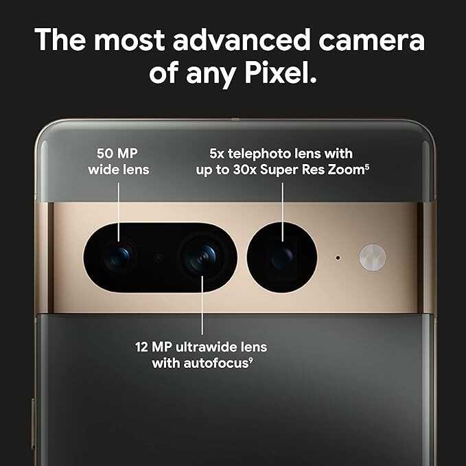 • Google Pixel 7 Pro has a 5x telephoto lens with 30x Super Res Zoom[5]; the upgraded ultrawide lens powers Macro Focus to capture the smallest details