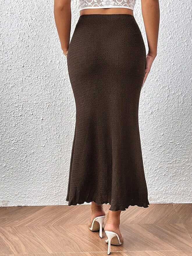 • Elastic high waist, solid color, ruffle hem, ruched, knitted bodycon pencil skirt for women and girls