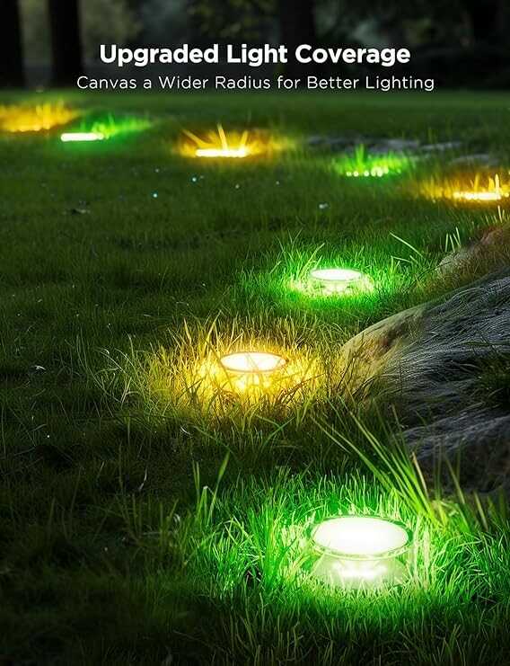 • Upgraded Lighting Effect: Govee Outdoor Ground Lights 2 have a reflective cover design, which makes the light radius cover more than 11 inches from the product base. The brighter and wider light coverage creates a better outdoor experience.