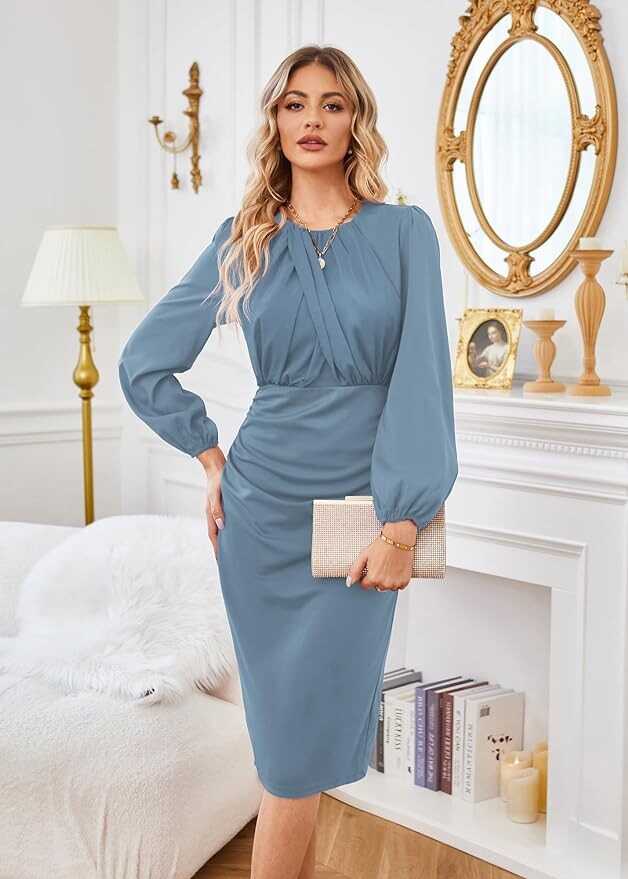 • 【Fashion Twist Front Design】Based on the classy midi sheath wrapped silhouette, it adopts the trendy front twist addition with a trendy mesh puff sleeve design, making it an elegant and stylish formal cocktail dress. The ruched waist can not only make it look elegant and fashionable but also help hide the belly greatly. Perfect for a business dinner or a dressy occasion.