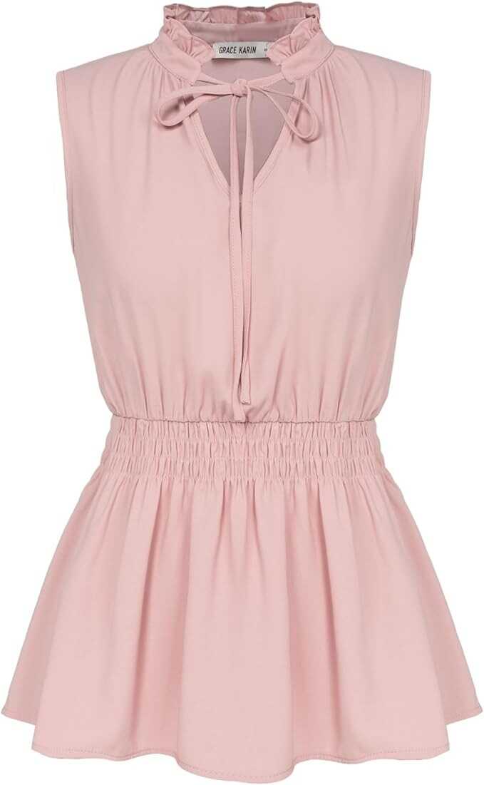 【Features】Sleeveless / Stylish Ruffled Stand Collar / V-Neck with String / Elastic Waist Band / Cute Ruffle Hem / Relaxed Fit / Dressy Elegant Casual Blouse / Hip Length / Summer Tops for Women 2024 / Comfortable and Lightweight / Fashion Blouse Top for Women