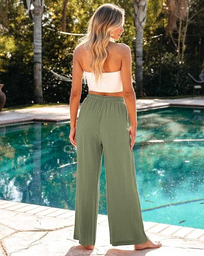 GRAPENT Wide Leg Pants Woman Linen High Waisted Pull On Flowy Casual Baggy Drawstring Palazzo Trousers Pants Resort Wear