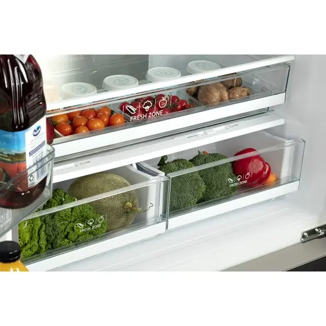 This 20.3 Cu. Ft. capacity Hamilton Beach French door refrigerator helps keep fruits and vegetables easily organized with a full width drawers and large door bin storage. The clean lines and modern form blend beautifully into your kitchen. Hamilton Beach delivers capacity, food organization, food preservation, quality, and consumer convenience.