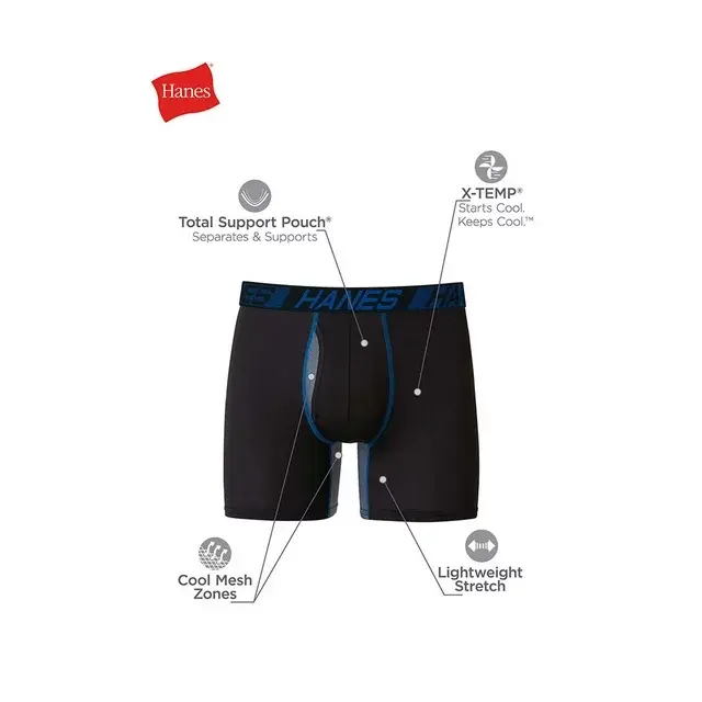 Hanes Total Support Pouch Men’s Underwear features X-Temp technology that starts cool and keeps cool all day long. These moisture-wicking boxer briefs feature a patented, innovative, breathable mesh liner that helps prevent chafing by separating and supporting. Odor protection and quick-dry fabric helps you feel fresh and keep dry during everyday activities and is highlighted by a lightweight stretch design that moves with you.