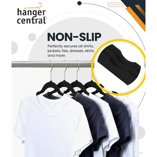 Set of 50 Hanger Central velvet clothing hangers measures 17. 5 by 0.24 by 9.06 inches each; 360-degree rotate feature. Strong enough to hold 10 pounds; ultra-thin construction is sturdy enough to hold your coats and pants. Made of sturdy material; the set of 50 hangers can hold and organize your clothes, saving space and tidying up your closet. Soft velvet, instead of plastic or metal, leaves no crease on a pair of pants when folded over, or a shirt or top hung over top. Non-slip black velvet design, with chrome finishing, ensures secure hanging of your clothes with a slim and sleek construction to maximize space in your closet.