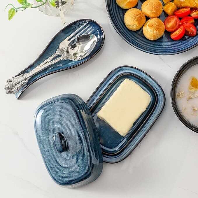 • VERSATILE AND EXQUISITE DESIGN: The spoon rest and butter dish is designed with blue reactive glaze which can add a modern touch to your home. And the spoon rest can use to place kitchen utensils, such as fork, knife, spatula, ladle and tong. You can use the butter dish to keep your butter fresh.