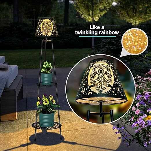 • INNOVATIVE SOLAR STREET LIGHT: This solar street light gets rid of the monotony of the traditional street light, the lampshade part of the lampshade is so cute with the owl carved by the hollowing out technique. The structure of the lamp body adopts a triangular structure, and there are two plant shelves underneath. You can put flower pots or some other garden statues on the shelves to enrich the decoration of the terrace garden patio.