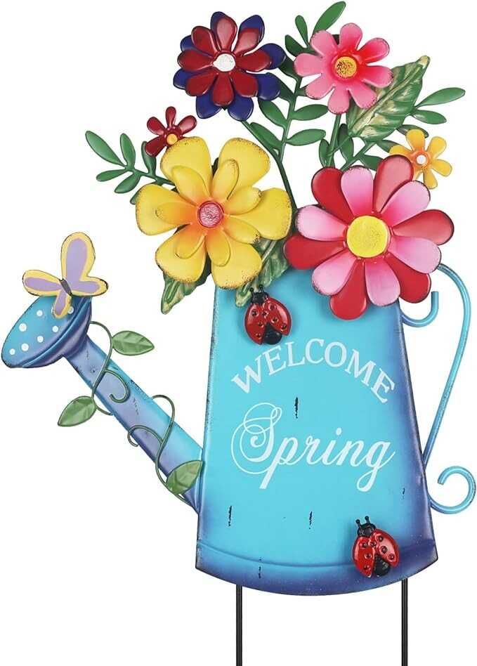 • ?【BRIGHT UP YOUR GARDEN】Bring the enchanting beauty of spring indoors with our exquisite garden stake. Crafted in the shape of a watering can, this stunning piece features an array of colorful iron flowers blooming on its surface, accompanied by charming ladybugs and butterflies. Adorned with the uplifting words "WELCOME" and "Spring," this piece not only adds a touch of elegance but also welcomes the fresh energy and vibrant colors of the season into your space.