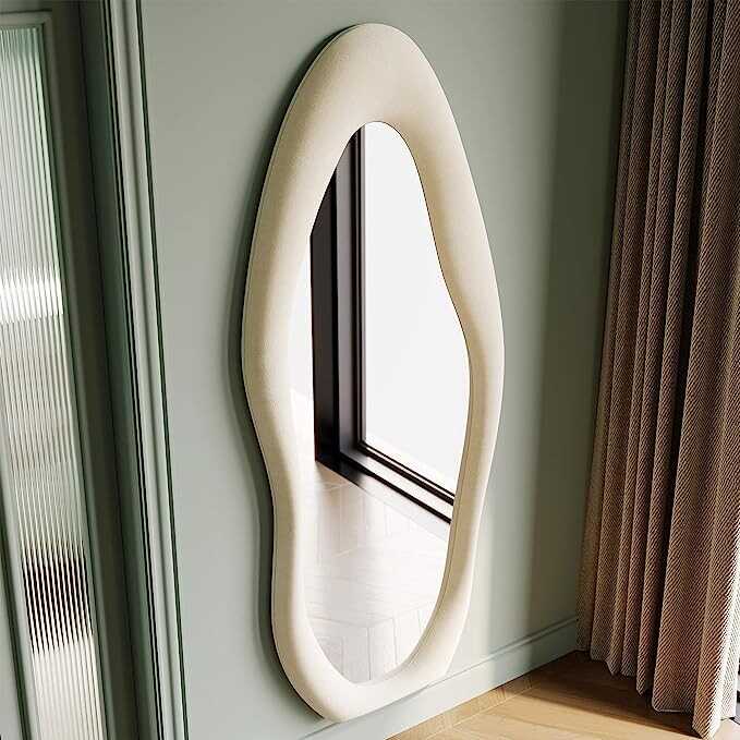 Honyee Full Length Mirror, 63" x 24" Wall Mirror, Flannel Wrapped Wooden Frame Full Body Mirror, Irregular Wavy Mirror Hanging or Leaning Against Wall for Cloakroom/Bedroom/Living Room, White