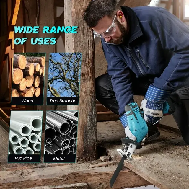 HUKOER 21V reciprocating saw provides better performance and a longer lifespan. The variable speed trigger provides stroke up to 4500 times per minute, depending on how hard it is pressed. Take on wood and PVC up to 4 inches thick ,and metal up to 7/8 inches thick. Suitable for pruning your tree and shrubs, demolition in small or difficult spaces, cutting plumbing pipes, making your pet house.