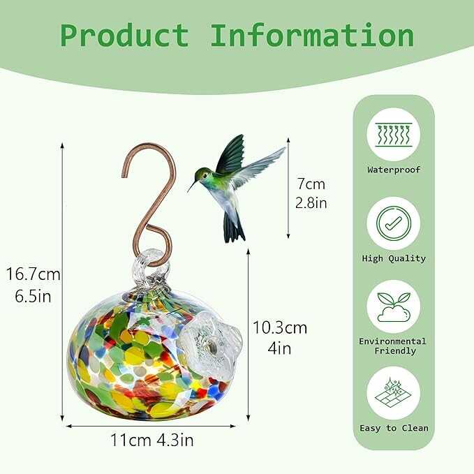 • Hand Blown Glass Hummingbird Feeder:This is a quality product made of glass, it is bright and beautiful. Main color is green, perfect for outdoors hanging decoration.