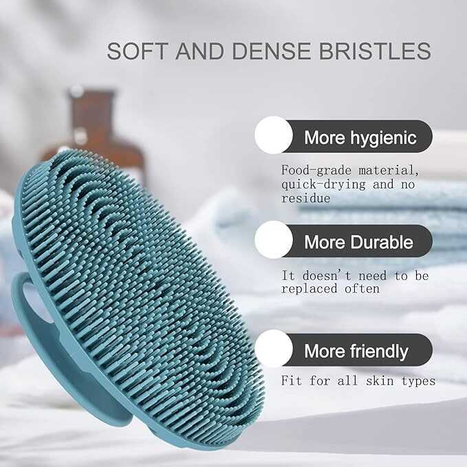 • This silicone shower scrubber will give you a comfortable massage feeling when you use it to scrub your body, perfect to relax muscles, relieve stress, promote blood circulation, and increase skin elasticity. This silicone natural bristles shower brush will be an essential part of your bathroom.
