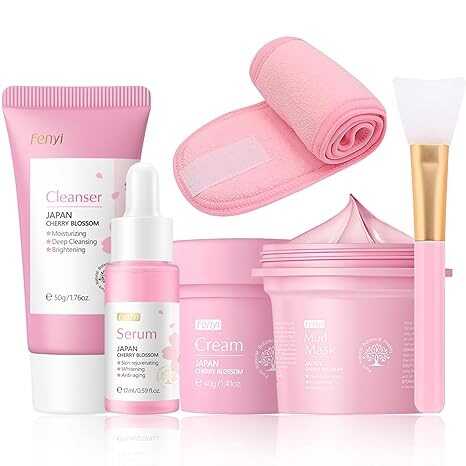 Japan-Sakura Skincare Set, Beauty Skin Care Products Set, Daily Skin Care Set for Women Girls, Skin Care Sets & Kits Includes Skincare Headband, Face Brush, Cleanser, Serum, Cream, Mud Mask