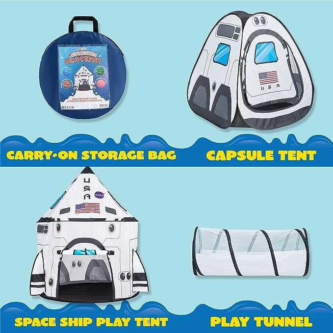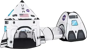 JOYIN White Rocket Ship Pop up Play Tent with Tunnel and Playhouse Kids Indoor Outdoor Spaceship Tent Set