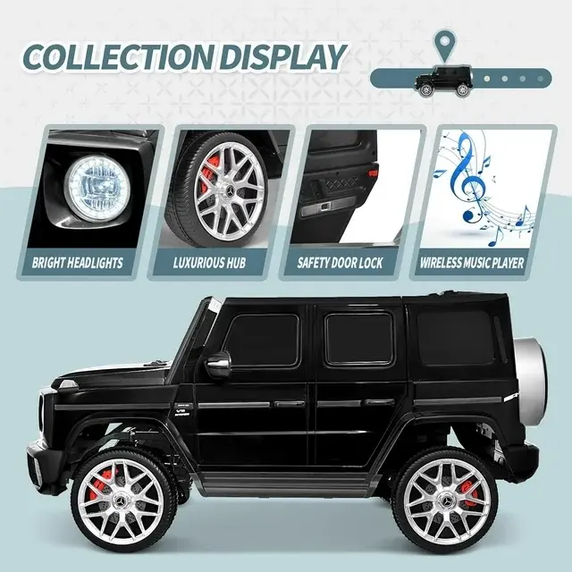 Joywhale 2-Seater Kids Ride on Licensed G63 has almost restored the real car's appearance, the luxurious and realistic appearance can give kids an excellent driving experience. And equipped with large 2-seater & powerful power configuration, which can provide strong power on various terrains for two kids. The 20" extended seat can give kids more comfortable driving experience. Kids also can enjoy a comfortable and smooth driving thanks to the four-wheel suspension and the soft braking system. The bumps on rough roads and the shock during braking can be significantly reduced. The seat belt and safety door lock can also protect little drivers' safety. Additionally, there is an emergency brake button on the remote control, which can stop the car immediately in case of an emergency. And it also provides various functions, Music/ FM Radio/ Bright Headlights/ Horn and more, kids can enjoy the fun of lights and music while driving. At the same time, it comes with a portable handle and folding wheels for easy carrying.