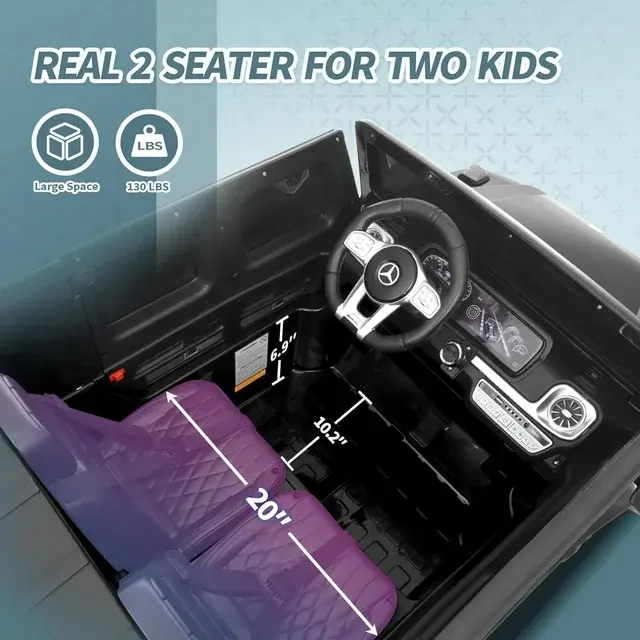 • Real 2-Seater & 12V Engine: Joywhale 12V Kids Ride on Licensed G63 has almost restored the real car's appearance, the luxurious and realistic appearance can give children an excellent driving experience. And equipped with large 2-seater & 12V dual motors power configuration, which can provide strong power on various terrains for two kids. The 20" extended seat can give kids more comfortable driving experience.