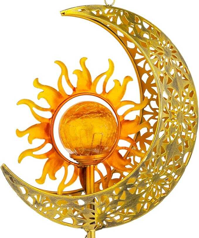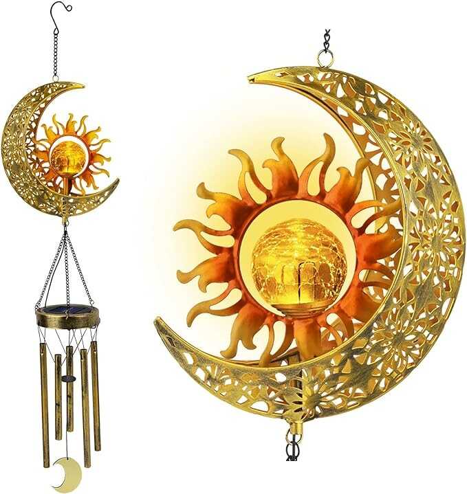 • ?Unique Design - Our LED solar light wind chimes designed into the shape of the moon. Being made of the premium material makes the Unique windchimes waterproof. Retro moon crackle glass ball wind chimes is composed of premium metal top with S hook, led light surrounded by the Sun shape frame and 5 bronze waterproof aluminum tubes. The beautiful wind chimes design spice up your garden, Garden, Yard, Patio and Lawn.