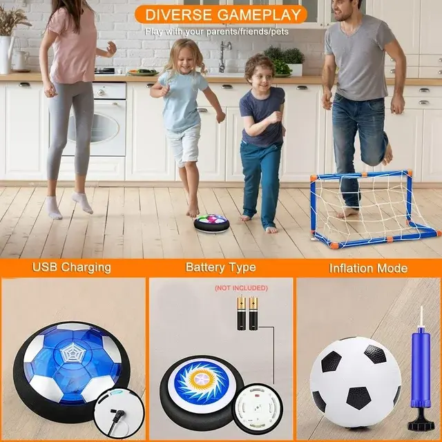 • ⚽?【Hover Soccer bowling Set】: The 3 Balls include: one hover soccer ball is powered by rechargeable lithium-ion battery 350 mAh, 40 minutes of play after 60 minutes of charging, one hockey floating air footballs powered by 3 AAA batteries(not included), one inflatable soccer - just inflate the ball with the pump. Let your kids experience joy through the sports game.