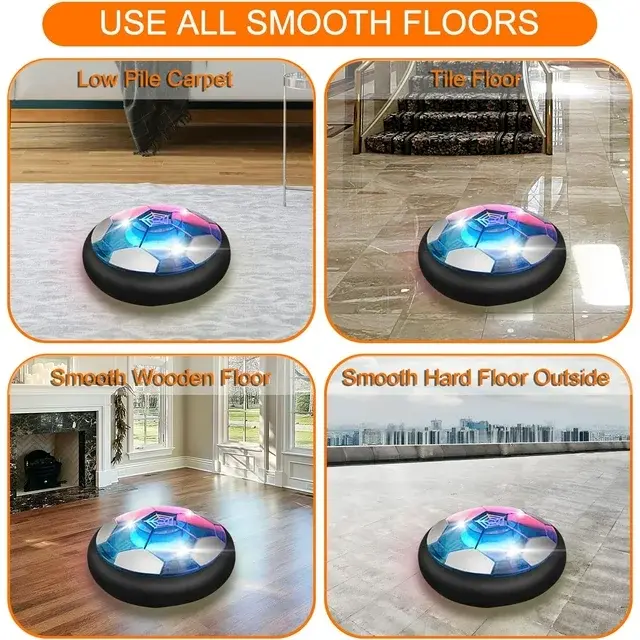 • ⚽? 【More Ways to Play】: Powerful fan floats allows the ball can slide on any flat floors perfectly, including hardwood floor, tile floor, basement, even low-pile carpet, so it is not merely a hockey ball, but also can be used as ice hockey, toy hockey set, knee hockey set, hover soccer ball, soccer toys at the same time.Can build a soccer or hockey field inside the house and outdoors. Whatever the bad weather, your child can create a variety of games with parents or friends.