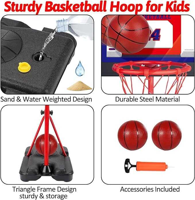 • 【Easy to Install & Sturdy Design】Greater stability is provided by a special structure and strong materials. The toddler mini basketball hoop's uprights are made of well-constructed solid steel, and the base is shaped triangularly to maximize stiffness. Add some water or sand to to reduce shaking, ensuring kids play the outside toys for toddlers 3-5 without worry! Extremely easy to assemble and take apart referring to the installation instruction. Reassuring boys toys age 4-6, toys for girls 7-8.