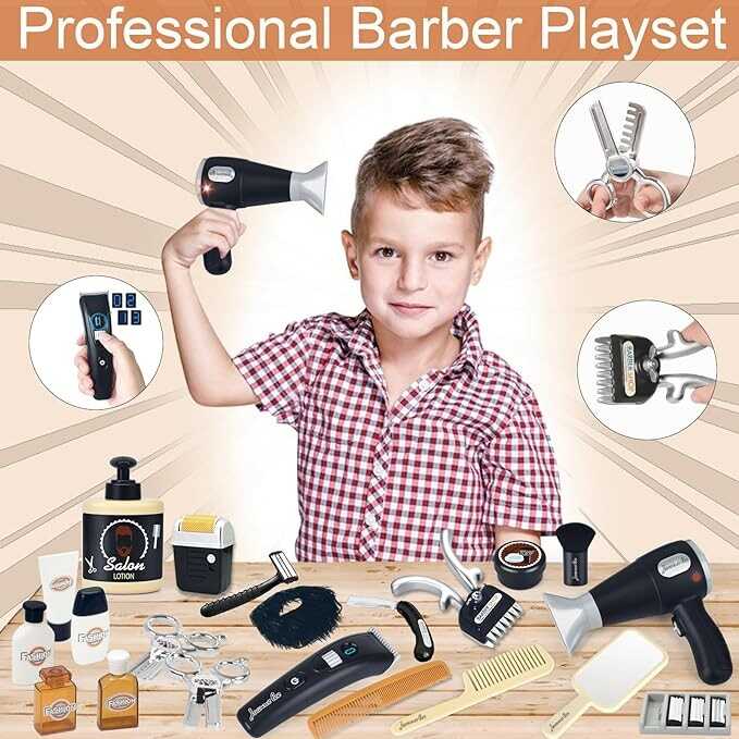 • Realistic and fun Kids Barbershop Playset: This shaving hair salon toy set includes 23 Pcs kids barber set toys, including Hair Spray, Mirror, Brush, Cleaning Brush, Hair Clipper, Rolling Razor, Replaceable Blade*3, Hand Shaver, Hair Oil, Shaving Cream, Manual Hairdresser, Blow Dryer, Comb, Scissors*2, Waist Tool Bag, Storage bag, perfume bottle and other boy salon styling accessories for your kid.