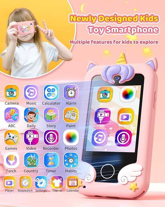 • [Multi-functional Kids Toy Phone] The kids phone toy is equipped with a 2.8-inch IPS touch screen and has multiple functions just like an actual phone. Kids can take pictures and videos, listen to music and stories, and play games. The pretend phone toy can also use as a torch, alarm, calculator and calendar. This play phone is a non-toxic, BPA-free, radiation-free and safe toddler toys for kids aged 3-7 years old who always want to use your phone.