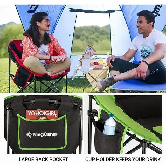 • 【Comfortable Experience】KingCamp Folding Camping Chairs is 33.5 inches wide, which is enough for a big guy to sit with. Moon saucer design folding chair applied curved ergonomic design, padded your body completely for all-around body comfort.