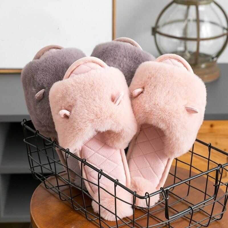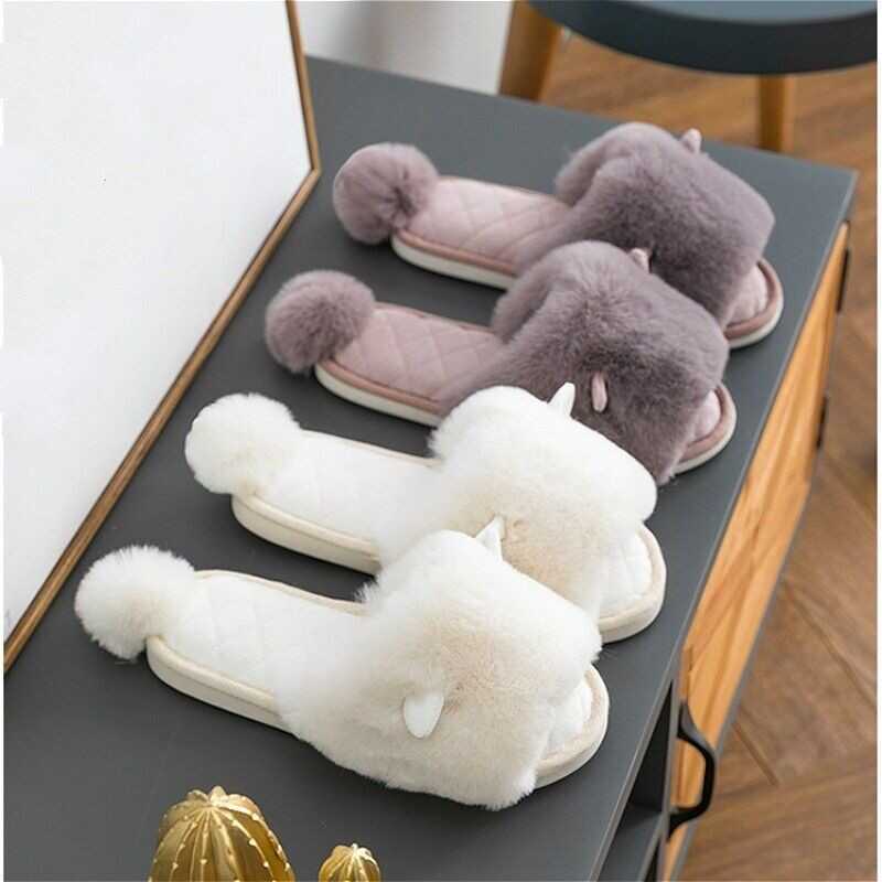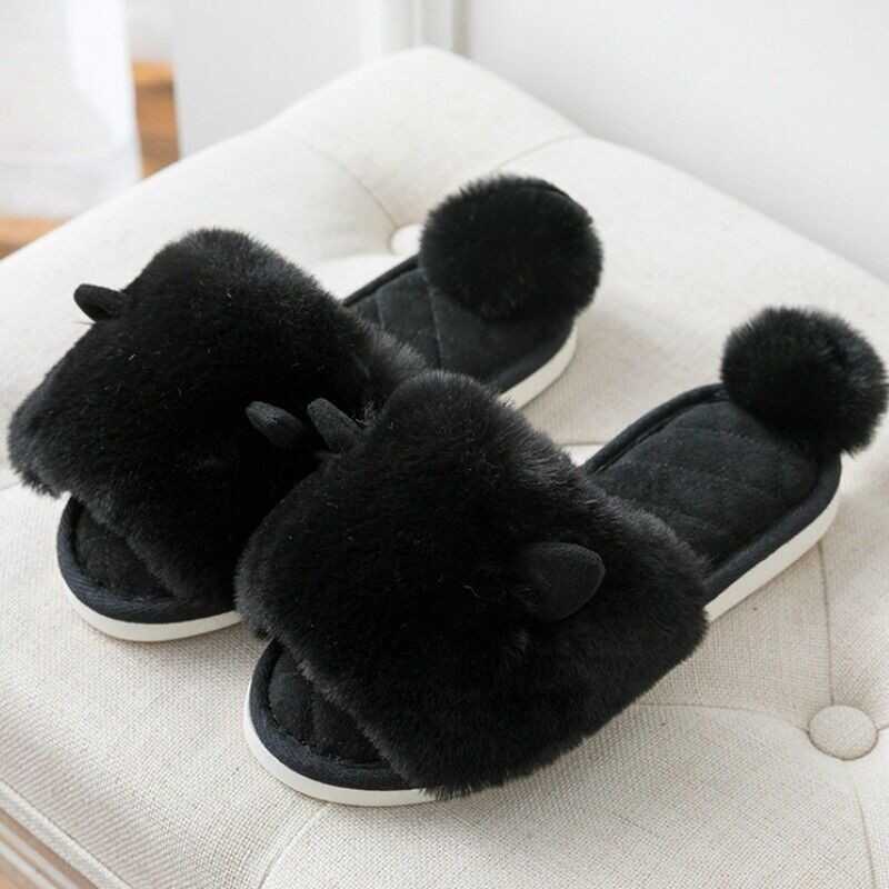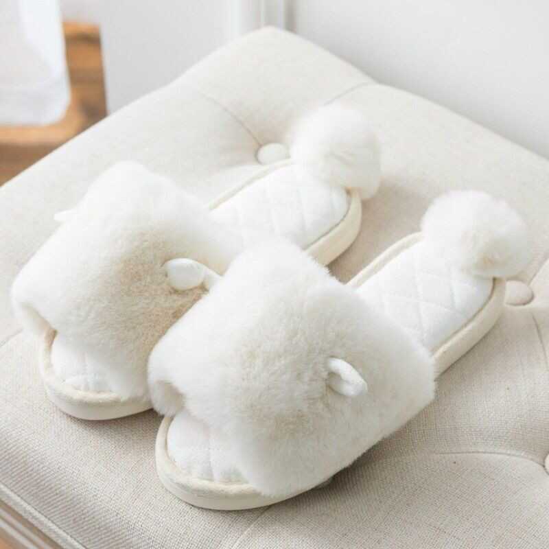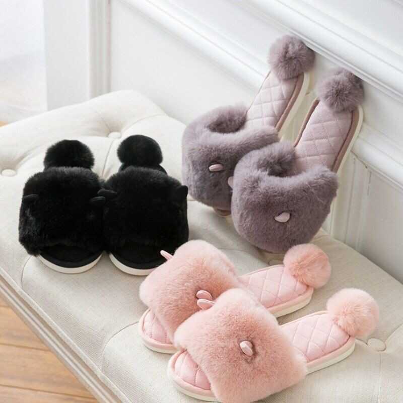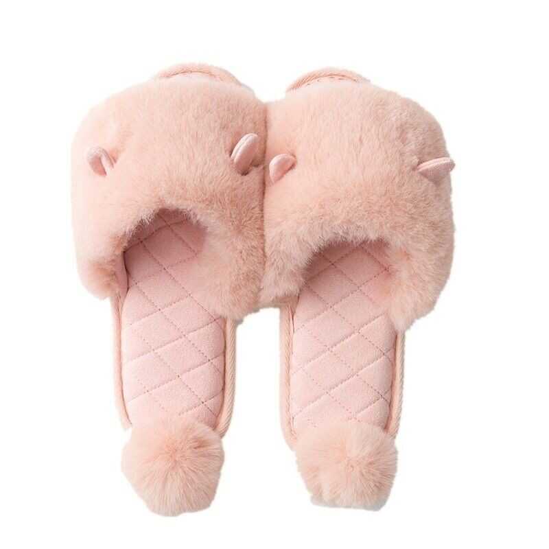 Ladies Winter Faux Fur Slippers Shoes Pom Pom Ear Warm Indoor Home Soft Japanese