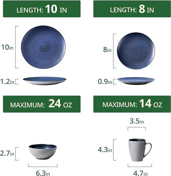 • WHAT'S IN THE BOX:Larinest dinnerware sets service for 4 that includes 4 of each of the following: 10" dinner plates, 8" salad plates, 6.49" soup/cereal bowls and 13.53 OZ Mugs.