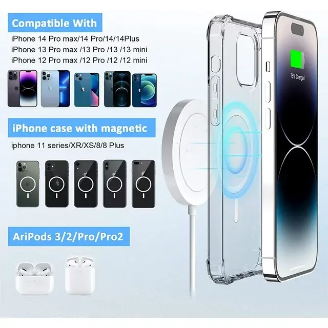 • 【Specifically Compatible with iPhone 15/14/13/12 Series】With New magnetic technology makes wireless charging a snap. Perfectly wireless charging pad compatible with mag-safe charging compatible with iPhone 15/15pro/15plus, compatible with iPhone 14, compatible with iPhone 14 Pro, compatible with iPhone 14 Plus, compatible with iPhone 14 Pro Max, compatible with iPhone 13,13 Pro,13 Pro Max,13 mini; compatible with iPhone 12, compatible with iPhone 12 Pro, compatible with iPhone 12 mini compatible with  iPhone 12 Pro Max.Up to 7.5W secure wireless charging. And with models of AirPods Pro /3 & 2 with a wireless charging case.
