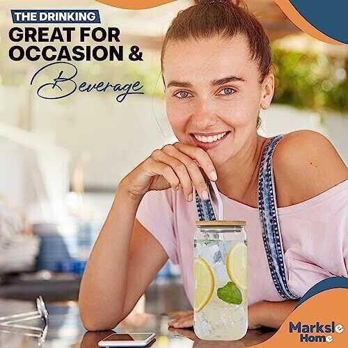 Marksle Home Glass Cups - Glass Cups With Lids And Straws - 16oz Iced Coffee ...