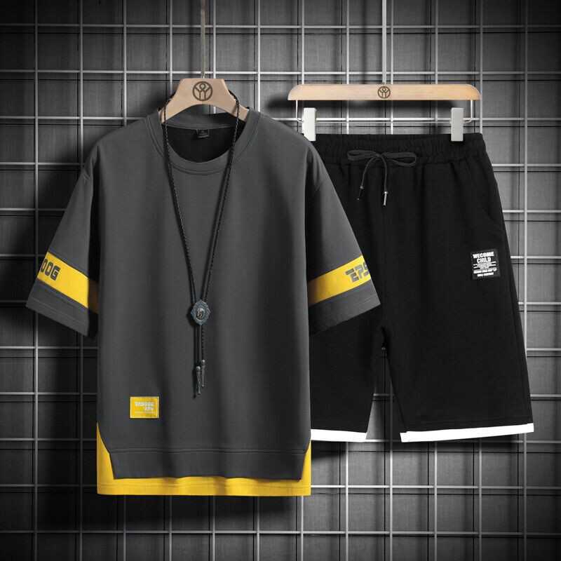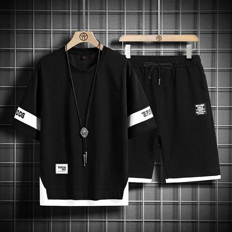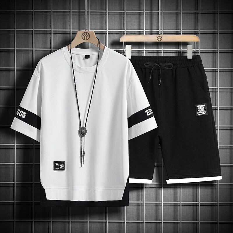 Mens Hip Hop Tracksuit T-shirt and Shorts Two Piece Set Patchwork Outfit Set