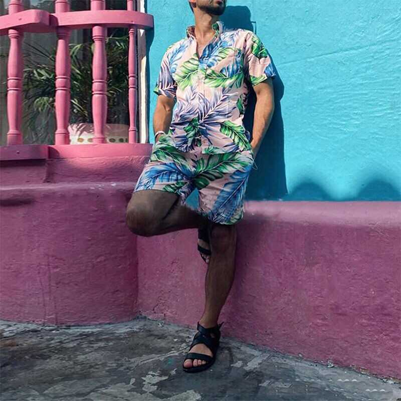 Men's Summer Hawaii Outfits Short Sleeve Shirts +Shorts Casual Beach 2Pcs Sets