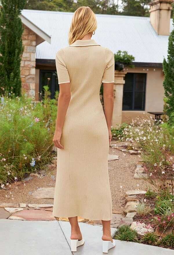 Feature: V neck, lapel neck, short sleeve, button-front, contrasting color details on the neckline and cuffs for a romantic style, fitted bodice and pleated fishtail skirt for a custom fit, ankle length, womens summer sweater dress, dresses for women 2024 casual