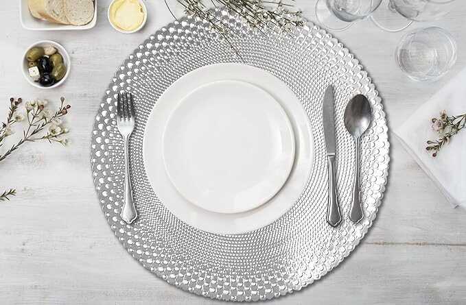 Metallic Placemats Set of 4 - Easy to Clean, Washable Decorative Place Mats for Kitchen and Dining Table - Non-Slip Round Table Mats - Dinnerware & Accessories - Dining Table Centerpiece Decor, Silver