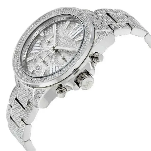Stainless steel case with a crystal pave stainless steel bracelet. Fixed stainless steel crystal pave bezel. Silver crystal pave dial with luminous silver-tone hands and index hour markers.