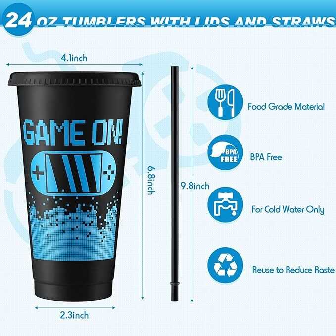 • Rich in Quantity: you will receive 24 pcs video game plastic tumblers with lids and straws in 6 different patterns, main colors are blue and black, enough quantity to meet your daily use and replace requirements, very suitable for the game theme party