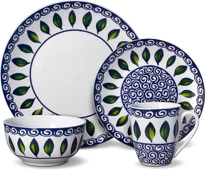 Mikasa Vienna 16 Piece Dinnerware Set | Elegant and Lightweight White Porcelain with Green Leaf & Blue Scroll Design | Service for 4 | Microwave & Dishwasher Safe