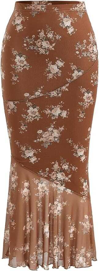 Feature: Floral Print, Ruffle Hem, High Waisted, Elegant Mesh Long Skirt for Women