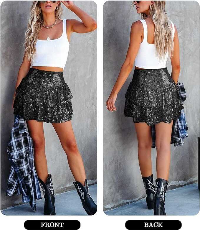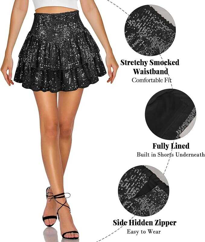 • 【Features】Shirred elastic high waist, stretchy smocked waistband, ruffle flowy, flared pleated hem, two-tiers of ruffles, invisible zipper, A Line, sparkling sequins, cute and trendy design, make you look beautiful, glamorous, sexy and elegant.