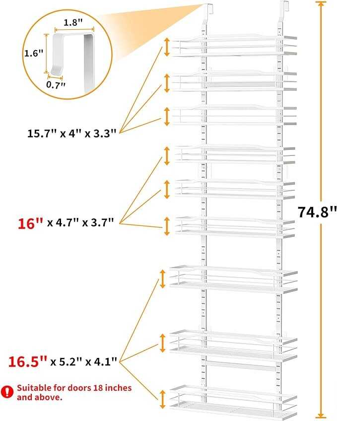 • You will get 3 large shelves (16.5"L x 5.2"W x 4.1H"), 3 medium shelves (16"L x 4.7"W x 3.7H"), 3 small shelves (15.7"L x 4" W x 3.3H"), including all necessary mounting hardware. The overall height after installation is 6.2ft, suitable for most doors. USPTO Patent Number:29884987. PLEASE NOTE: You may receive the wrong package showing "8-Tier", but the item inside is completely correct 9-tier.
