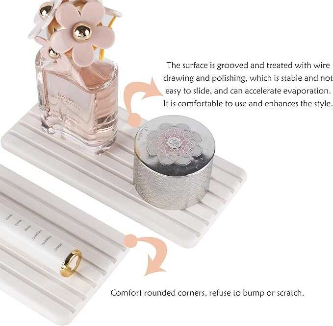 Made from natural Diatom mud and plant fiber, small holes within diatomite enable it have amazing water absorption. They could absorb water and gets dry in a few minutes. It makes the Bathroom Counter top more dry and tidy.