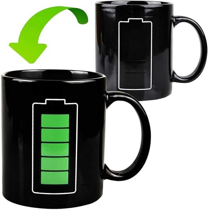 • Battery Pattern Design: The mug is printed with a battery pattern that changes from light to dark when filled with hot drinks, as if the battery is fully charged.
