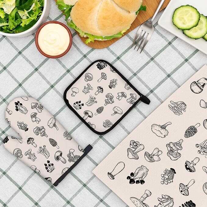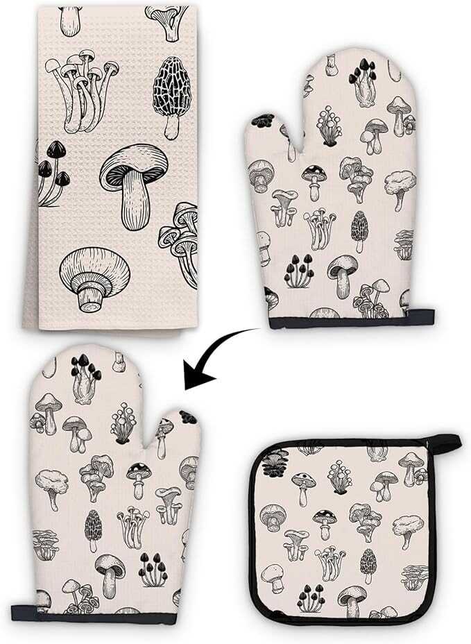 OHSUL Mushroom Kitchen Towels and Oven Mitt Pot Holder Set, Beige Mushroom Kitchen Decor and Accessories, Mushroom Gifts for Women Heat Resistant Oven Gloves Hot Pads Hand Towels for Kitchen