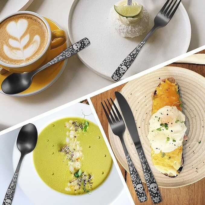 OIULO Pattern Matte Silverware Set for 8,40-Piece Gothic Skull Black Flatware set,Skeleton Flower Unique Pattern Design,Satin Finish Knives Forks Spoon Cutlery Halloween Event Tableware Fine Utensils